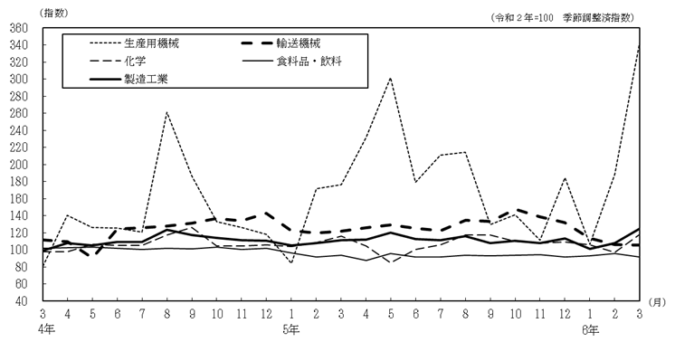 生産指数(季節調整済指数)は124.6で前月比15.7%上昇し、2か月連続して上昇した。全国の製造工業指数(同)は101.1で前月比3.8%上昇した。また、原指数は146.8で前年同月比8.1%上昇し、3か月ぶりに上昇した。
