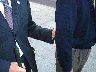- 握られた腕は、自分の身体から離したり、前後に振らないように自然に下におろしてください。身体から離すと相手との間隔が広くなってしまいます。
