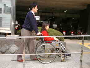 車両進入用にスロープ状になっている歩道では、車道側に車椅子が傾くので注意してください。