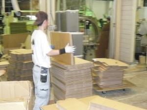 当社は段ボール製品の製造、組立、販売などを行っている会社です。現在7名の知的障害者(うち5名は重度障害者)が段ボール製品の組立やバリ取り(型で抜いた段ボールの縁を取る作業)、ワイヤー止めなどの仕事をしています。