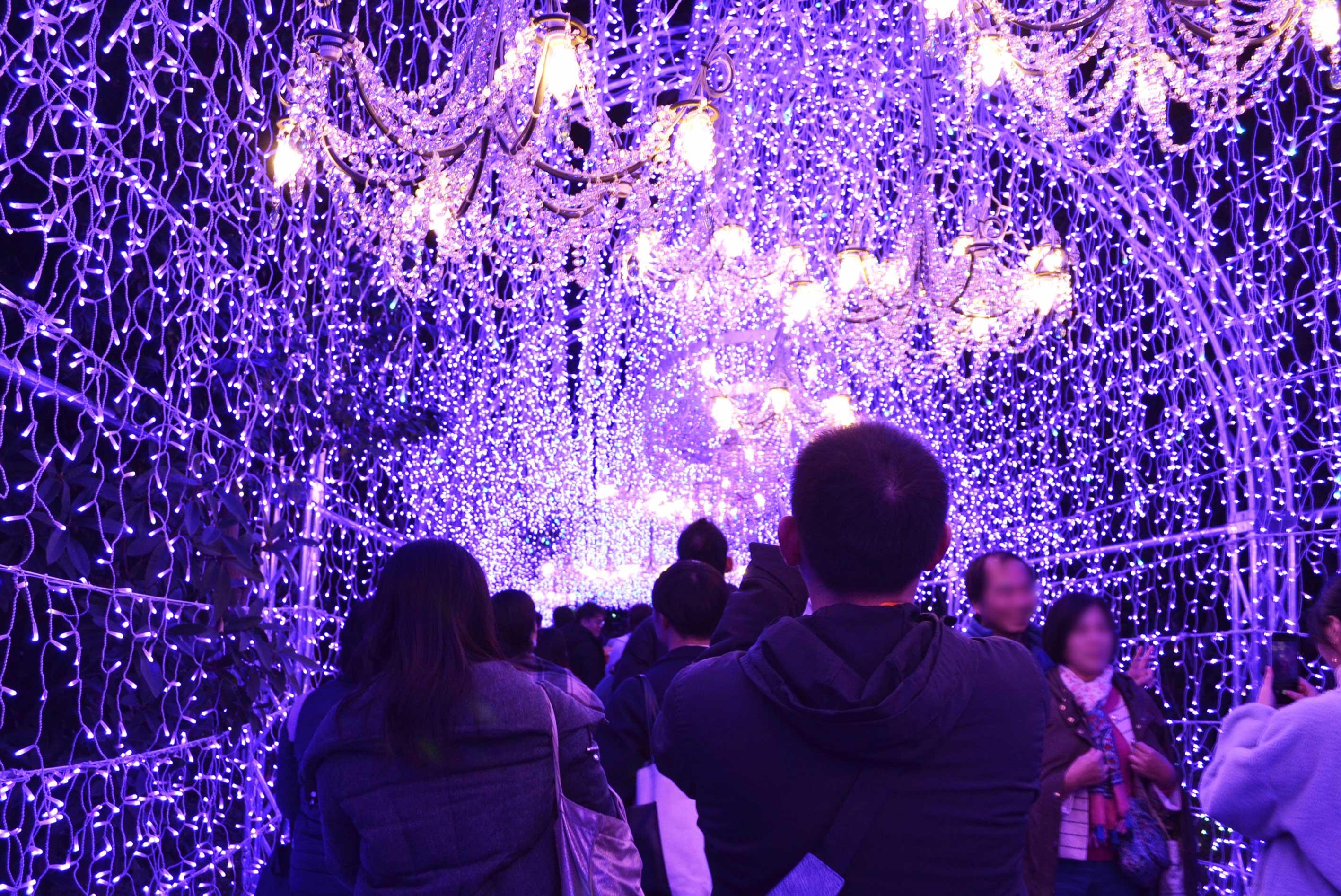 この後、参加者たちは光に満たされた苑内を散策しました。ゴージャスなシャンデリアが輝くイルミネーションのトンネルを通り抜けると、先ほどまで散策した時とは違う世界にワープしたかのよう。参加者たちにはこの非日常的な世界を存分に楽しんでいただきました。