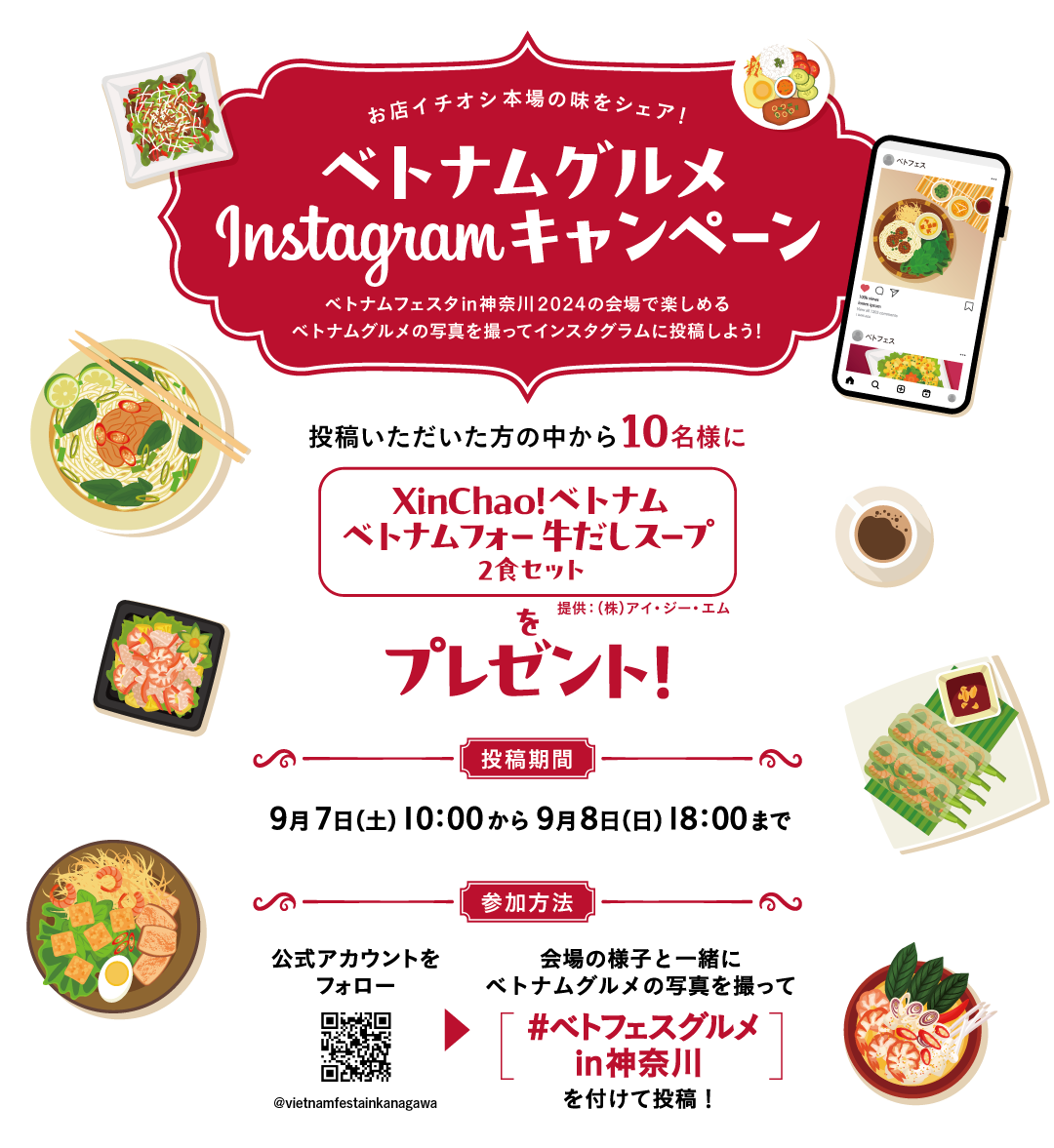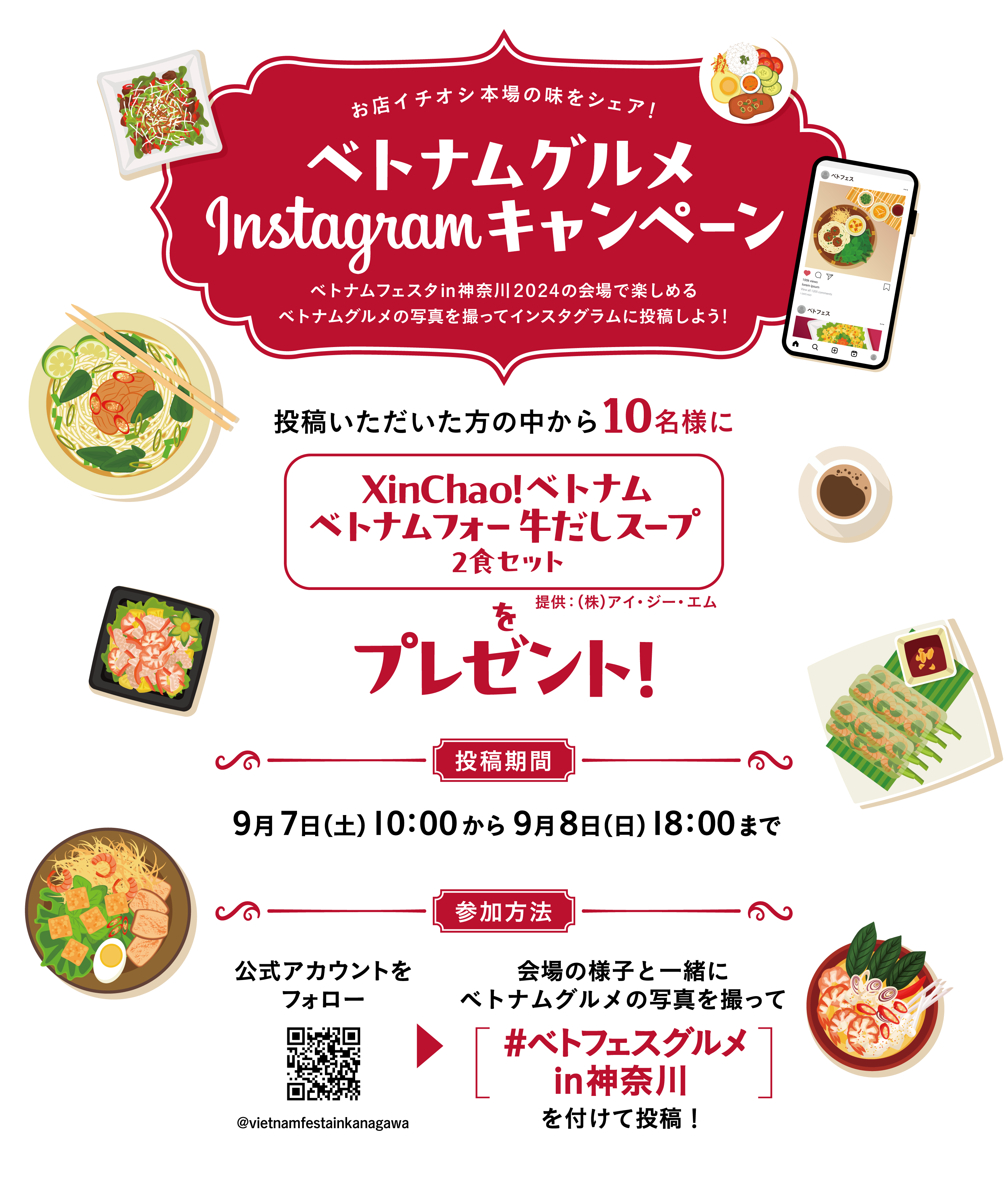 ベトナムフェスタ in 神奈川 2024では、Instagramと連動したキャンペーンを2024年9月7日(土)10:00から9月8日(日)18:00まで実施いたします。このキャンペーンは、ベトナムフェスタ in 神奈川の公式インスタグラムをフォローし、ベトナムフェスタin神奈川2024の会場で楽しめるベトナムグルメの写真を「#ベトフェスグルメin神奈川」を付けて投稿いただいた方の中から抽選で素敵な商品を贈呈するキャンペーンです。