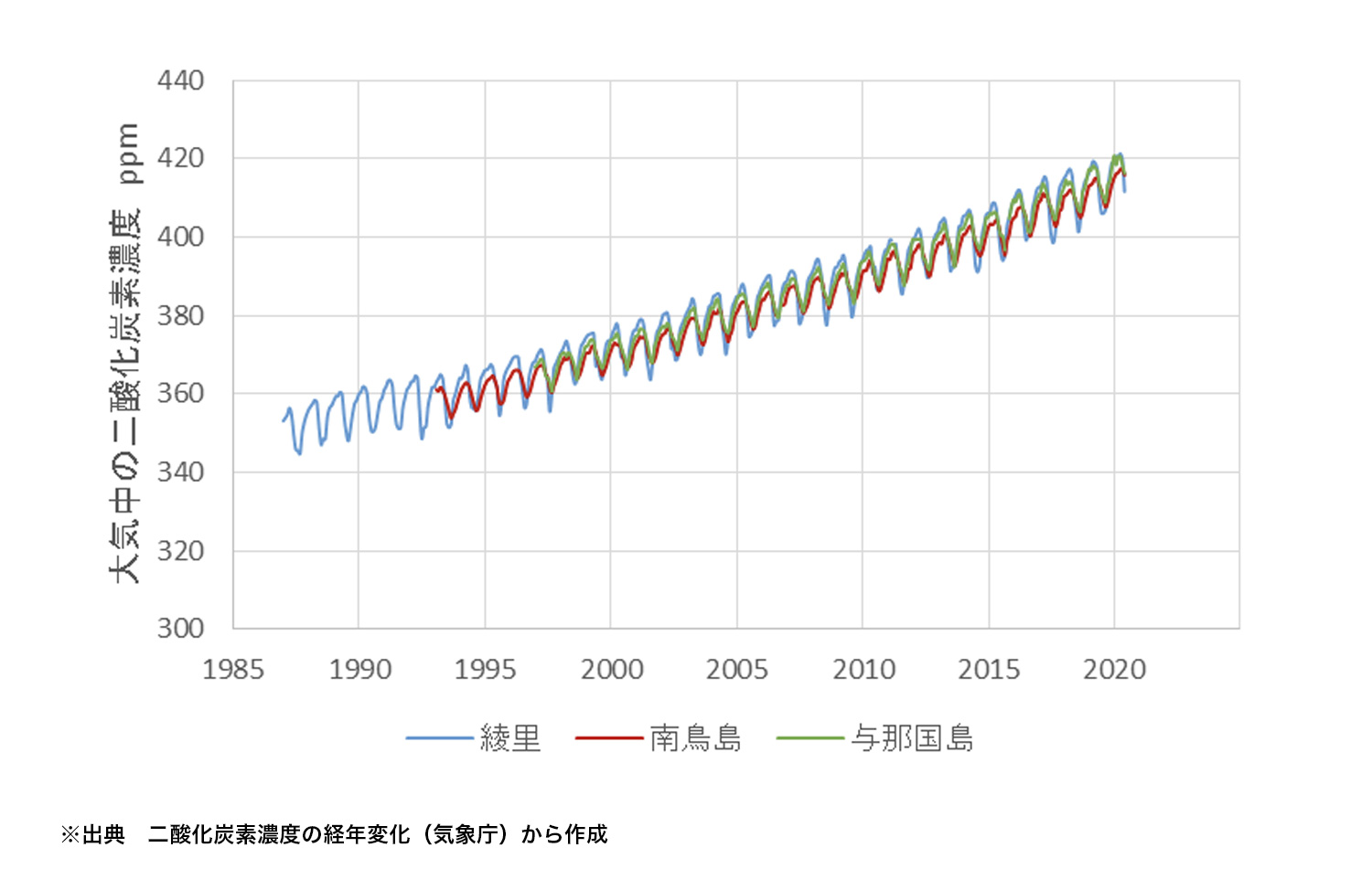 日本における二酸化炭素濃度は、3地点(綾里、南鳥島、与那国島)で継続的に観測されており、2014年には年平均値が綾里と与那国島で初めて400ppmを超えました。
