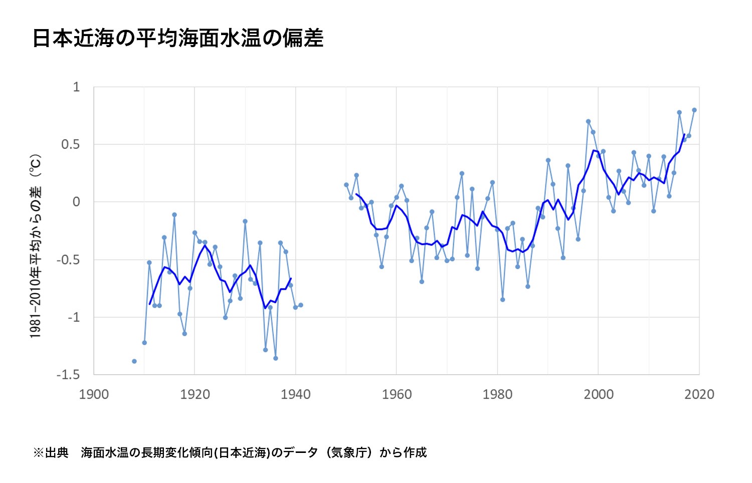 この上昇率は、世界全体や北太平洋全体で平均した海面水温の上昇率(それぞれ0.55℃/100年、0.53℃/100年)よりも大きくなっています。 また、およそ100年間にわたる日本全国の年平均気温の上昇率(1.24℃/100年)と同程度の値です。