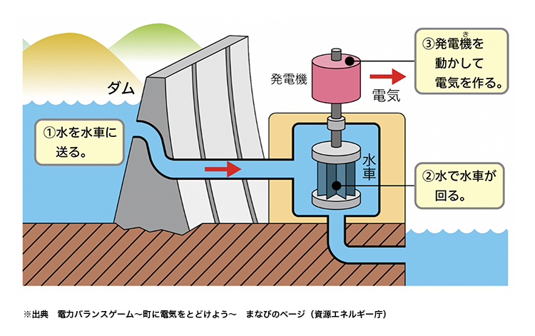 水力発電は、高所から流れ落ちる河川などの水を利用して落差を作り、水車を回し発電するものです。利用面から流れ込み式(水路式)、調整池式、貯水池式、揚水式に分けられ、揚水式以外を特に一般水力と呼んでいます。揚水式は、電力需要が供給より小さい時間帯に下池の水を上池に揚げ、必要時に放流して発電するため、他とは区別されています。一般水力、及び揚水を含む全水力発電の設備容量は2018年度末で5,004万kWに達しており、年間発電電力量は874億kWhとなりました。