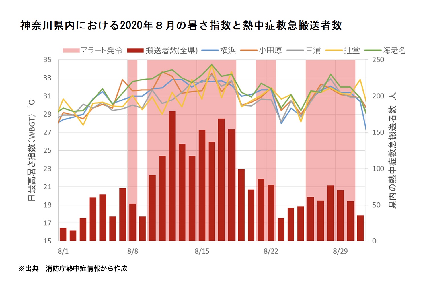 神奈川県では、2020年8月に17回の熱中症警戒アラートの発表があり、発表があった日には、救急搬送される方が多く熱中症リスクが高かったことが分かります。