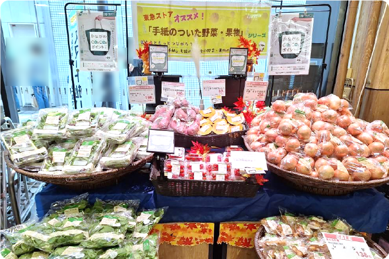 2024年度の「かながわCO2CO2ポイント+」では、「手紙のついた野菜と果物」の減農薬・減化学肥料商品を対象にTOKYUポイントの上乗せを実施したところ、対象商品の売上点数が前年比で130%を超え、3か月間で約 7.4t-CO2のCO2削減効果がありました。2025年度は新たにエコ包装(ノントレー)の精肉商品も対象商品に追加しました。環境課題の解決につながる商品をお客さまに分かりやすく展開することは、今後の弊社の成長を促すことにつながると考えています。