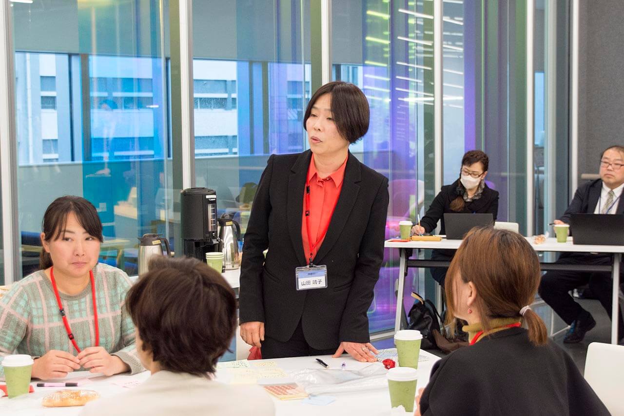 議論の後は、各テーブルの代表者が意見を発表していきます。「予定管理アプリを使って、他の従業員にも休みを明確に示して休む体制をつくる」「休日を決めた上で作業を行う」「外出する仕事を入れて強制的に農作業から離れる」などの意見が飛び交いました。