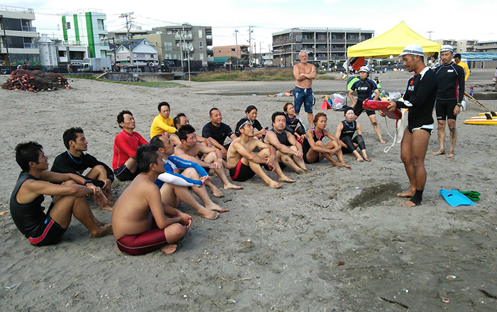 The group has been active in Chigasaki since 1993 and has been involved in activities that unite with the local community. These include training lifesavers, raising awareness of lifesaving activities by holding junior lifesaving classes, contributing to the local community by running first aid/rescue workshops, and even lending wheelchairs specially designed for the beach.