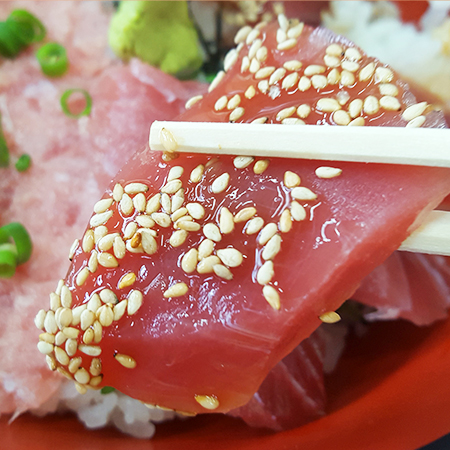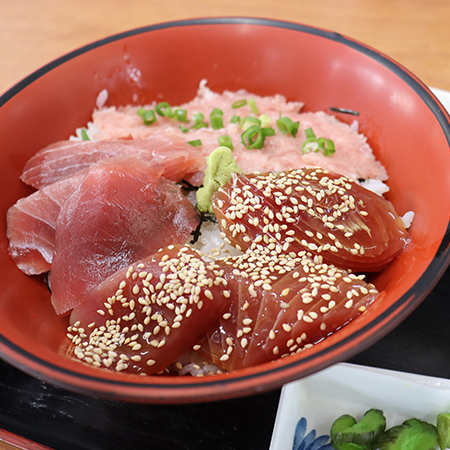For lunch in Jogashima, we recommend "Jogashima Shopping Street." The surrounding area is lined with traditional seafood restaurants, souvenir shops, rice cracker shops, and sweets shops. You can choose from a variety of types and sizes of the popular tuna bowl, so choose the one that suits your taste!