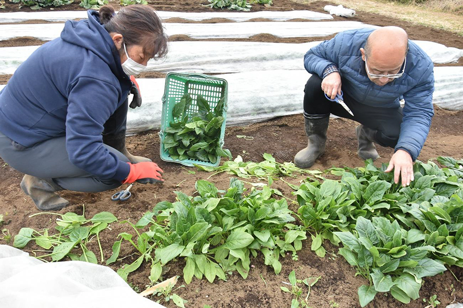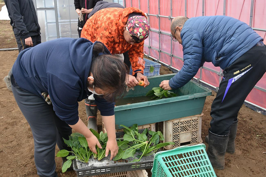 ホウレンソウ、ブロッコリー、キャベツにニンジン…開園時に撒いた種が順調に育ち、現在は収穫時期を迎えています。野菜はすべて無農薬栽培です。傷んだ葉を取り除きながら黙々とホウレンソウの収穫をしている参加者に「正月にお餅何個食べた?」と利用者が話しかけます。「お雑煮に入れて10個も食べちゃったよ」と答える参加者。手を動かしながら傍で作業する仲間と自然に会話が生まれ、ともに笑みがこぼれます。