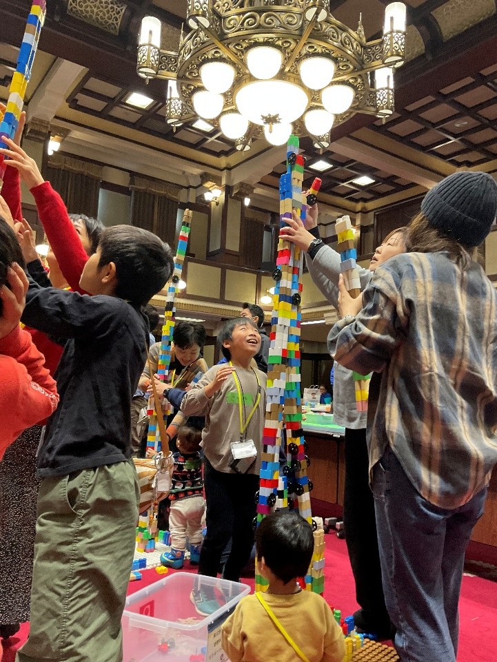 メインプログラムでは、新聞紙を自由に使って大きな森をつくる体験や、 工夫を凝らしてブロックを高く積み上げる遊びが行われました。 単に遊ぶだけでなく、参加者がそれぞれの多様な感性や、 考え方の「違い」を体験できるのがこのイベントの醍醐味です。