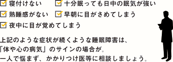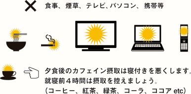 長時間労働で睡眠不足が続く、休日にまとめて寝だめをする、徹夜を繰り返す、こうした不規則な睡眠習慣はこころの健康を害し、長引けば、不眠症、うつ病等の精神疾患へとつながる可能性があります。下記を参考に上手に睡眠をとる工夫をしてみてください。また、2週間以上不眠が続くときは、うつ病などの精神疾患の可能性があります。医療機関を受診してみましょう。