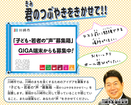 今、子育て中の方も、これから子どもを出産したいと思っている方も、おじいちゃんおばあちゃんも、企業団体の方も、皆さんで、「子どもや若者にとって何がいいか」を考えるきっかけになることを願っています。