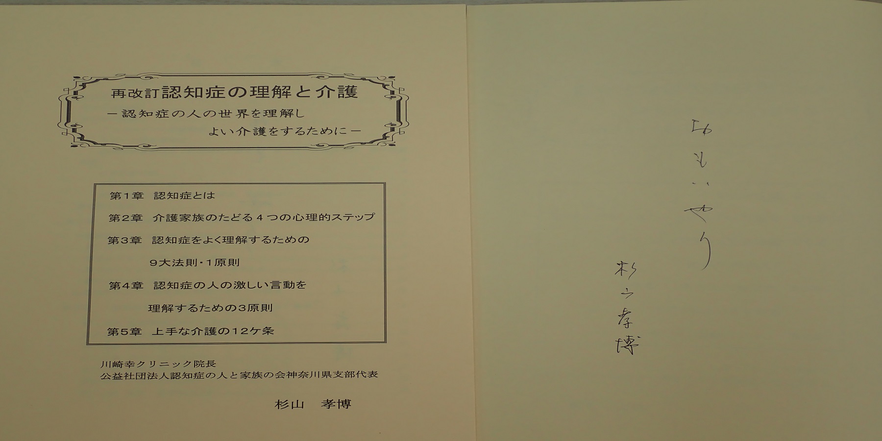 この仕事を続けられるのか不安になっていた時、職場の先輩から読むように薦められたのが『認知症の理解と介護-認知症の人の世界を理解し、よい介護をするために-(杉山孝博川崎幸クリニック院長著)』だった。最初は分からない部分もあったが、ふと表紙の裏を見ると、杉山孝博さん直筆の『おもいやり』という文字が目に入った。「(それからは)どんな時でも相手に対するおもいやりを大事にして、少しずつ認知症のケアに慣れていった」と長谷さんは話す。