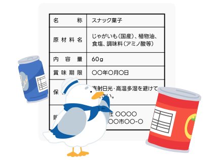 みんなが食べているお菓子は、たくさんの材料を使って作られているよ。そのお菓子には、どんな材料が入ってるか、いつまでに食べればいいのかなどが書いてあるところがあるんだ。それが食品表示だよ!