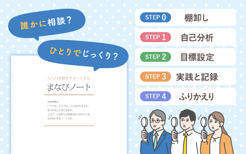 「まなびノート」は、学びを始めたい人をサポートしてくれるノートです。自分の中にある“考え”や“気持ち”などを整理し、文字としてこのノートに書き出してみることで、自分自身についてふりかえったり、学びの計画をたてたり、人それぞれのニーズや状況に応じた使い方ができます。