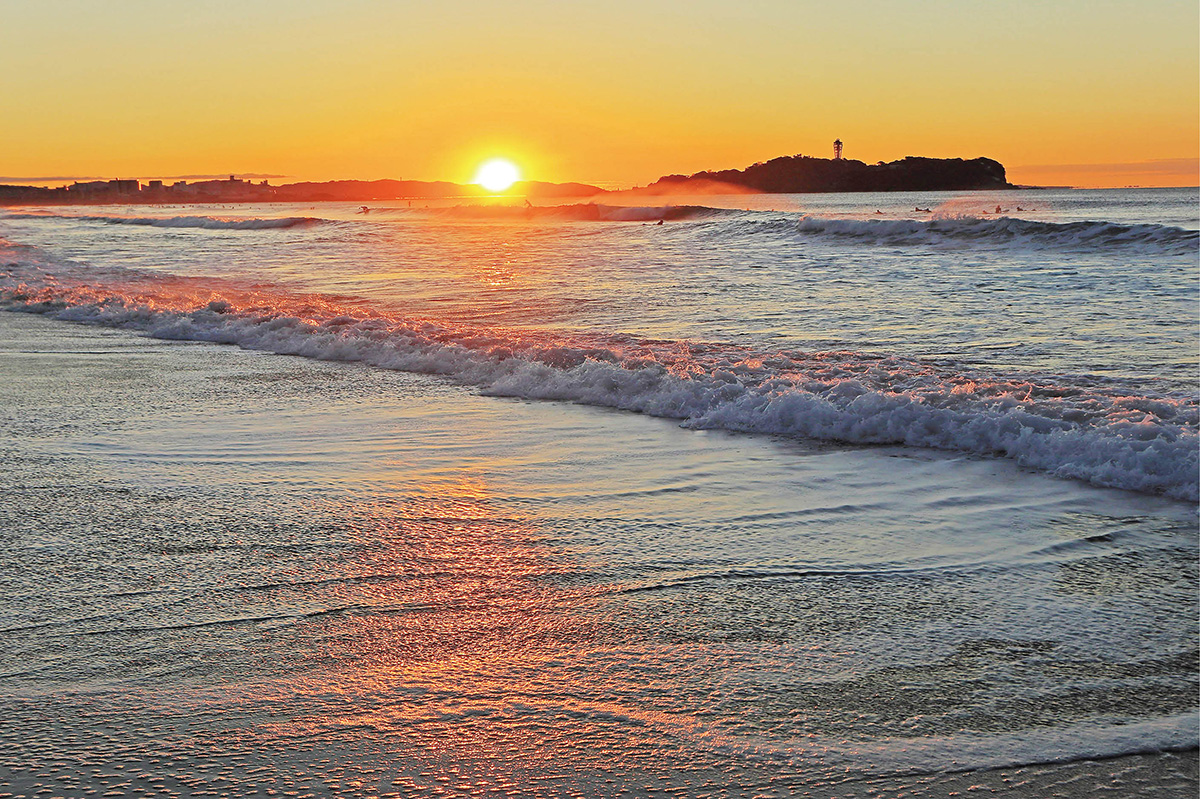 江の島の左から昇る初日の出を見ようと多くの人が集まる辻堂海岸で、太陽の光が砂浜を染める瞬間にシャッターを切りました。